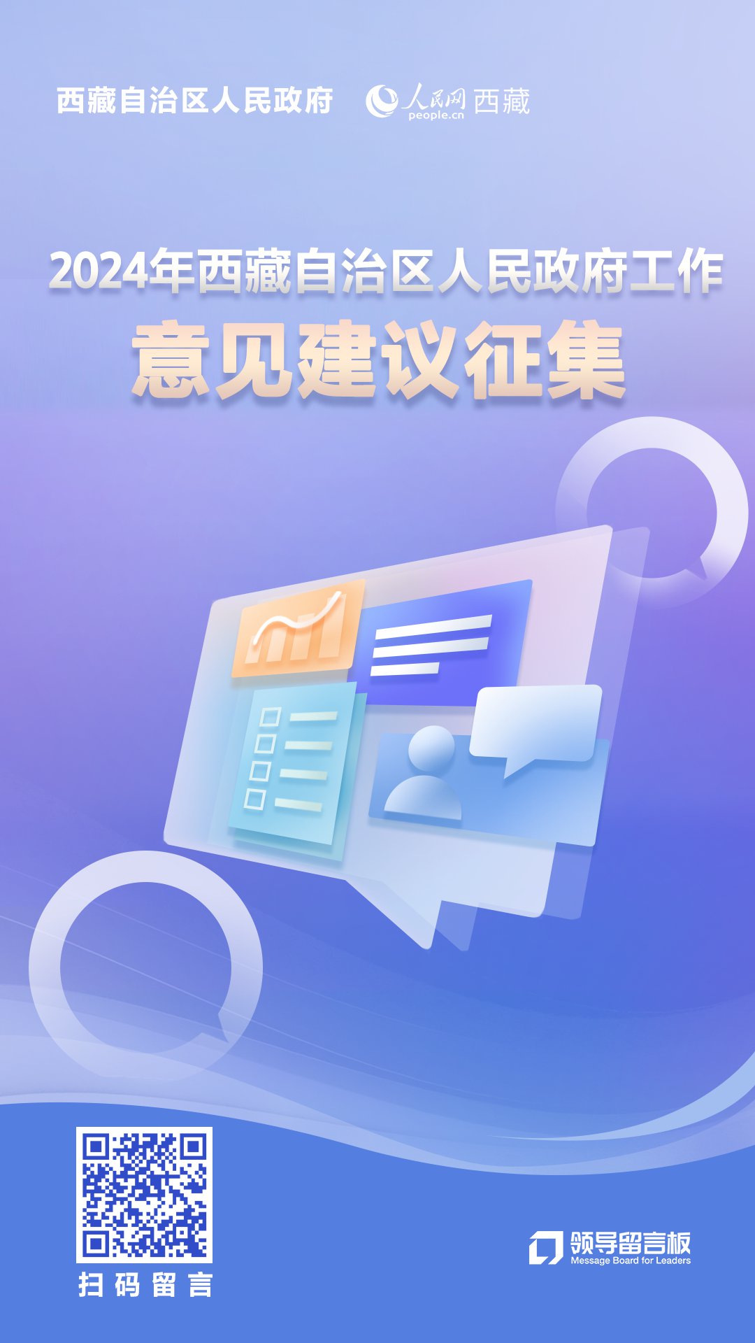 人民网拉萨11月10日电 (记者吴雨仁)开门纳谏、问政于民。为科学谋划明年西藏自治区政府工作,起草好2024年自治区《政府工作报告》,从2023年11月10日至12月20日,西藏自治区人民政府联合人民网依托“领导留言板”开通政府工作征求意见栏,面向社会公开征集关于2024年政府工作的意见建议,希望广大群众和社会各界人士聚焦“四件大事”“四个创建”,积极建言献策,更好推动西藏长治久安和高质量发展。
